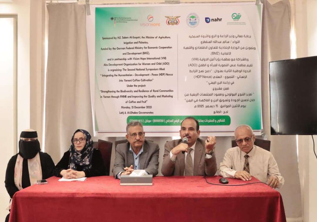 تحت رعاية معالي وزير الزراعة والري والثروة السمكية اللواء سالم عبدالله السقطري انطلقت صباح اليوم في العاصمة عدن الندوة الوطنية الثانية بعنوان دمج نهج الترابط الثلاثي (الإنساني–التنموي–السلام) في تطوير زراعة البن اليمني" والتي نظّمتها منظمة عبس التنموية،بالتعاون مع وزارة الزراعة والري والثروة السمكية وبالشراكة مع منظمة رؤيا أمل الدولية بتمويل من الوزارة الاتحادية للتعاون الاقتصادي والتنمية الألمانية (BMZ) وذلك ضمن مشروع “تعزيز التنوع البيولوجي وصمود المجتمعات الريفية من خلال تحسين الجودة وتسويق البن والفاكهة في اليمن لحج الضالع أبين بحضور عدد من المسؤولين وممثلي منظمات دولية ومحلية.