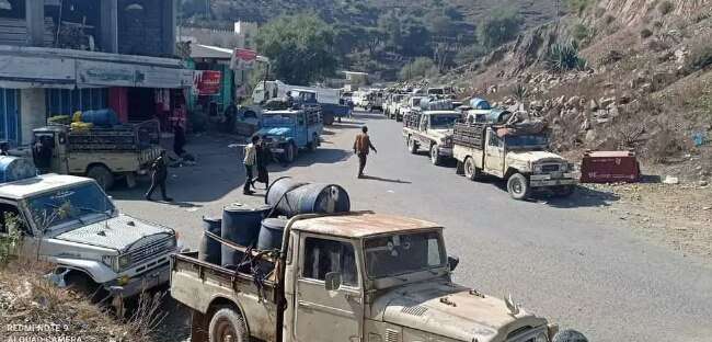 وتتجمع مئات الشاحنات الكبيرة والمتوسطة المحملة بالمشتقات النفطية، داخل مديرية المواسط التي يحكمها عسكرياً اللواء 35 مدرع.