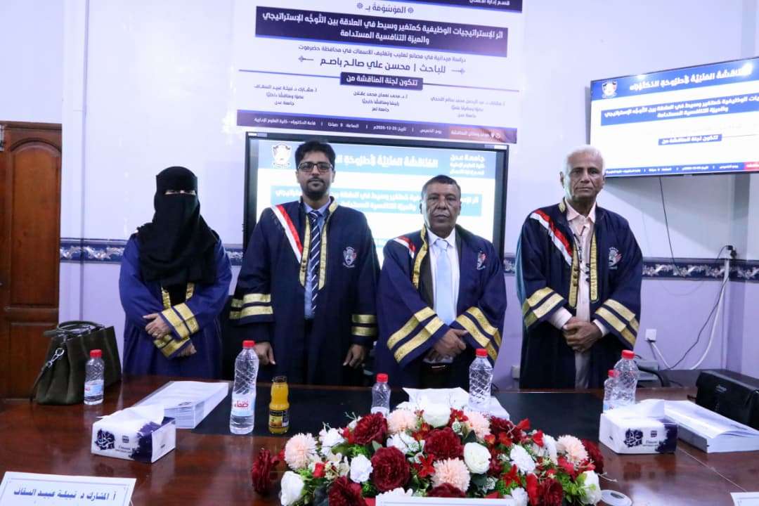 عقدت في رحاب جامعة عدن، بكلية العلوم الإدارية، بقاعة الدراسات العليا، جلسة مناقشة أطروحة الدكتوراه للباحث/ محسن علي صالح باصم، الموسومة بـ: (أثر الإستراتيجيات الوظيفية كمتغير وسيط في العلاقة بين التَّوجُّه الإستراتيجي والميزة التنافسية المستدامة: دراسة ميدانية في مصانع تعليب وتغليف الأسماك في محافظة حضرموت).