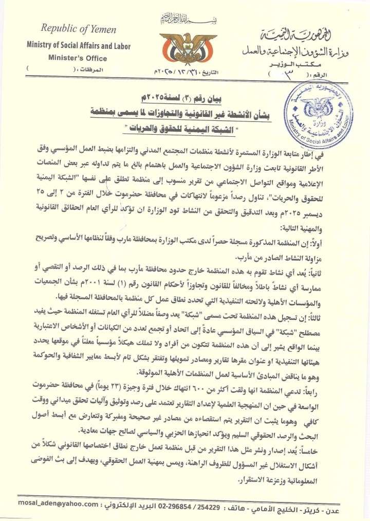 في إطار متابعة الوزارة المستمرة لأنشطة منظمات المجتمع المدني والتزامها بضبط العمل المؤسسي وفق الأطر القانونية تابعت وزارة الشؤون الاجتماعية والعمل باهتمام بالغ ما يتم تداوله عبر بعض المنصات الإعلامية ومواقع التواصل الاجتماعي من تقرير منسوب إلى منظمة تطلق على نفسها "الشبكة اليمنية للحقوق والحريات"، تناول رصداً مزعوماً لانتهاكات في محافظة حضرموت خلال الفترة من ٢ إلى ٢٥ ديسمبر ٢٠٢٥م وبعد التدقيق والتحقق من النشاط تود الوزارة ان تؤكد للرأي العام الحقائق القانونية والمهنية التالية: