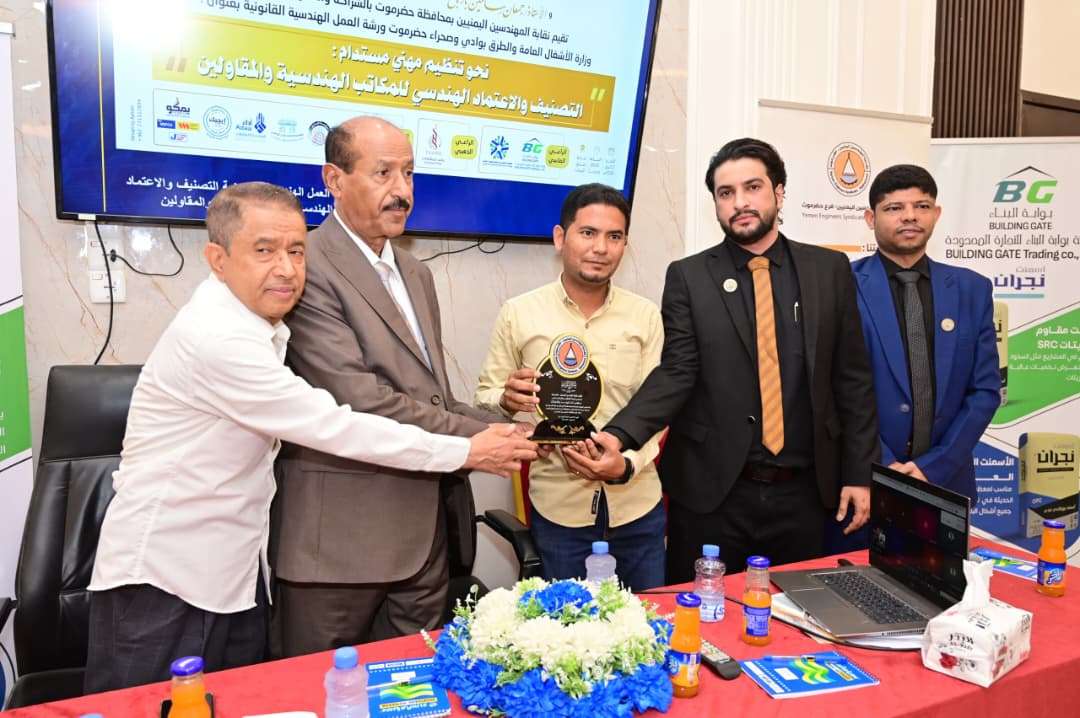 من جانبه، أوضح رئيس نقابة المهندسين بحضرموت، المهندس/ عمر مبروك مخير، أن هذه الورشة تأتي في إطار جهود النقابة لتنظيم العمل الهندسي وتعزيز أنظمة التصنيف والاعتماد، بما يضمن رفع كفاءة الأداء المهني، وتحسين جودة المخرجات الهندسية، وحماية حقوق المهندسين والمقاولين على حد سواء بالمحافظة حيث اشار المهندس مخير ان الاعتماد والتصنيف للمكاتب والمقاولين من اهم الامور الهامة في المرحلة القادمة مما سيعكس على جودة التنفيذ والإشراف على مختلف المشاريع الهندسية .