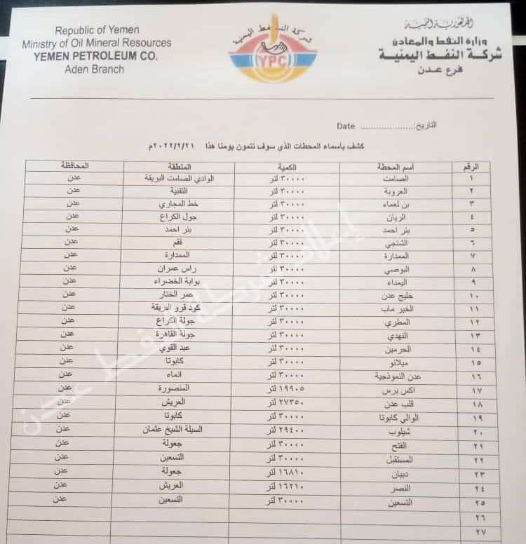 نشر اعلام شركة النفط، كشف المحطات الأهلية في مناطق المحافظات التي تقع ضمن النطاق الجغرافي لتسويق الشركة (عدن ، لحج ، أبين ، الضالع) والتي تم تموينها اليوم الإثنين ٢١ فبراير ٢٠٢٢م من منشأة عدن الصغرى التابعة لشركة النفط عدن ، وبالسعر الرسمي