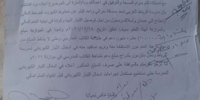ناشد شيخ منطقة الرباط محافظة لحج الشيخ عبدالحكيم عبدالله فضل أبو علي ، مدير عام كهرباء لحج بسرعة ادخال التيار الكهربائي إلى مدرسة الرباط بموجب توجيهات المحافظ ومدير عام مديرية تبن ، والتي منذ عام 2021 والى اليوم لم يتم تنفيذها ولو بتركيب الاعمدة والشبكة ، على اعتبار المديرية قد ساهمت بمبلغ 10 مليون ريال يمني من مبلغ الموازنة لعام 2021 الخاص بطباعة الكتاب المدرسي ، وتعهد المديرية باعتماد نفس المبلغ لطباعة الكتاب لعام 2022م .
