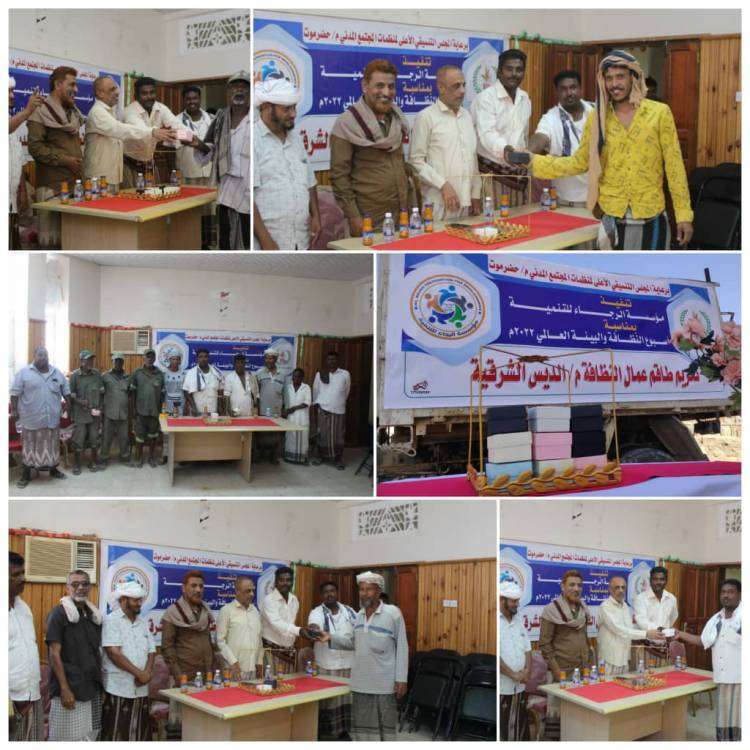 أخبار محلية برعاية المجلس التنسيقي الأعلى لمنظمات المجتمع المدني محافظة حضرموت تم تكريم طاقم عمال النظافة بمديرية الديس الشرقية