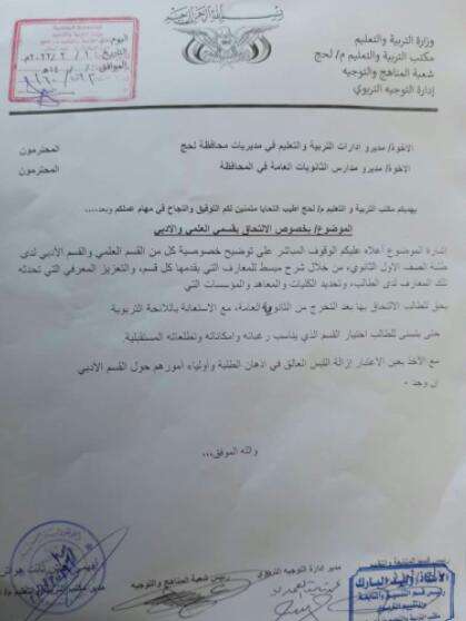 تربية لحج توجه إدارات الثانويات بخصوص التحاق الطلاب بقسمي العلمي والأدبي