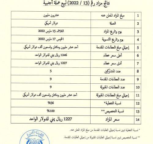 أعلن البنك المركزي بعدن اليوم الثلاثاء الموافق 15 مارس 2022م، عن نتائج المزاد رقم (13-2022) لبيع عملة أجنبية، والتي أعلن عنها يوم الأحد الماضي.