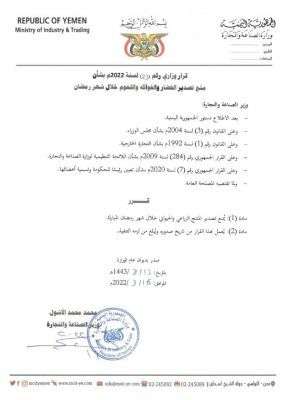 أصدر وزير الصناعة والتجارة محمد محمد الاشول، اليوم، قرار رقم 23 لسنة 2022 م بمنع تصدير الخضار والفواكه واللحوم خلال شهر رمضان.