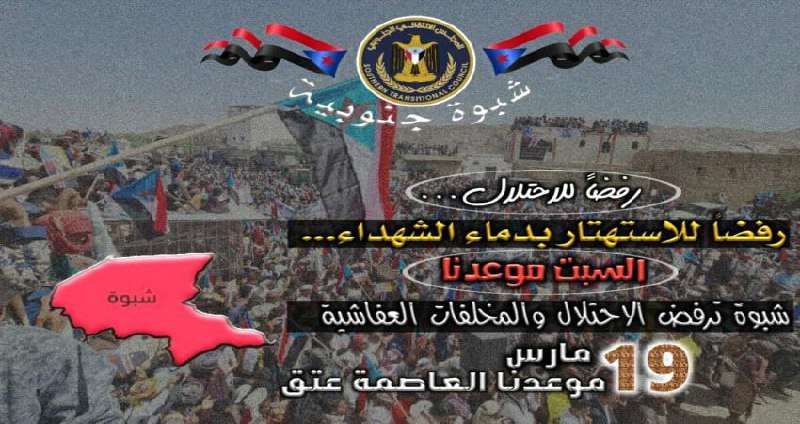 دعت الهيئة التنفيذية للقيادة المحلية للمجلس الانتقالي الجنوبي بمديرية جردان محافظة شبوة كافة أبناء المديرية للمشاركة في الفعالية الجماهيرية التي ستقام في العاصمة عتق رفضاً لاي مكونات مشبوهه واحزاب يمنية على أرض شبوة، تلبية لدعوة رئيس القيادة المحلية للمجلس الانتقالي الجنوبي بالمحافظة العميد علي أحمد الجبواني والذي دعا أبناء شبوة للخروج والمشاركة في الفعالية التي ستقام في العاصمة عتق رفضاً لاعادة الأحزاب اليمنية معتبرين ذلك استهتار بتضحيات أبناء الجنوب فمن يريد ان يعيد المكونات التي شاركت في قتل أبناء الجنوب، وان يعيدها من شبوة فهو واهم .
