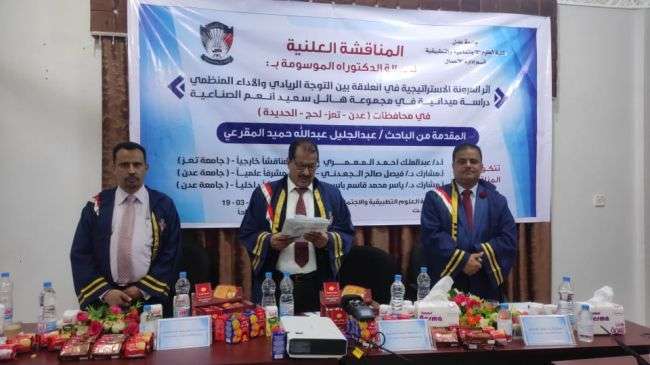وذلك عن الرسالة العلمية الموسومة بـ:"أثر المرونة الاستراتيجية في العلاقة بين التوجه الريادي والاداء المنظمي"، دراسة ميدانية في مجموعة هائل سعيد أنعم الصناعية بمحافظات (عدن، تعز، لحج، والحديدة).