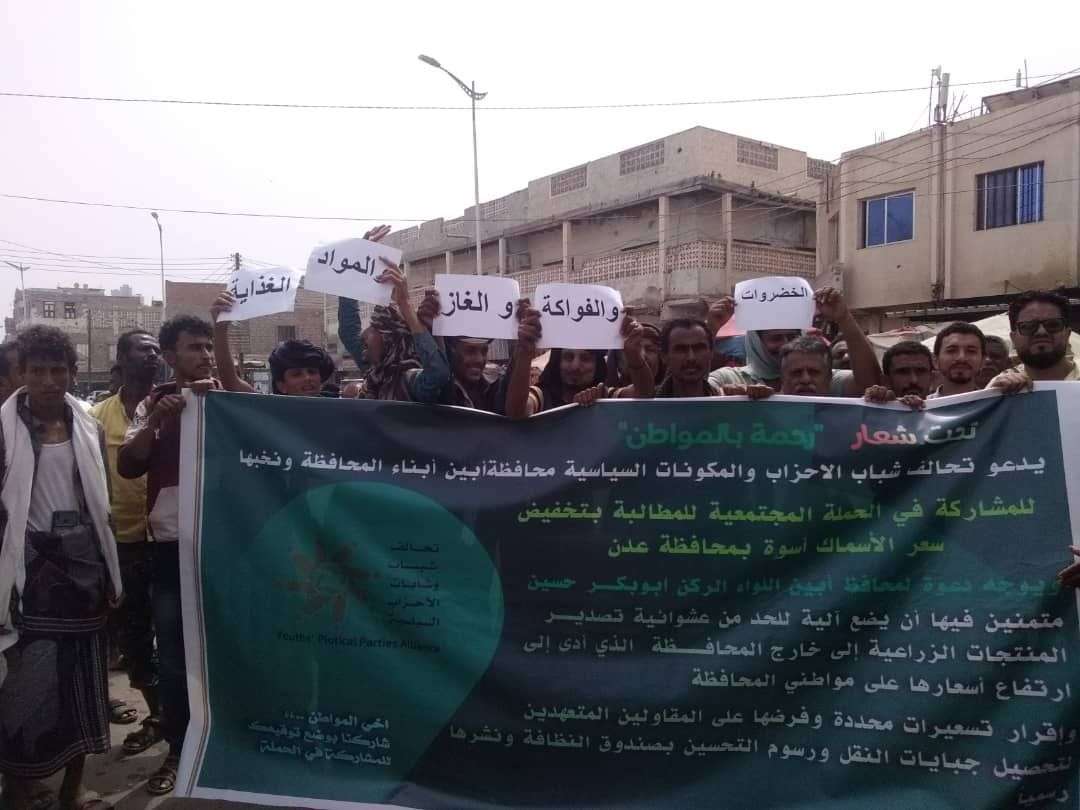 نفذ صباح اليوم شباب وشابات تحالف الأحزاب والمكونات السياسية بمحافظة ابين بمعية حشود من المواطنين بسوق مدينة زنجبار عاصمة محافظة أبين وقفة احتجاجية منددة تحت شعار “رحمة بالمواطن” دعوا من خلالها كافة شرائح وأبناء المحافظة بمن فيهم نخب المجمتع للمشاركة في الحملة المجتمعية المطالبة بتخفيض أسعار المواد الغذائية والفواكه والخضروات ، والغاز ، والأسماك أسوة بالعاصمة عدن.