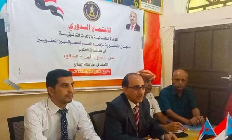 وترأس الاجتماع، الذي عُقد في مقر القيادة المحلية لانتقالي محافظة الضالع الدكتور صالح المرفدي رئيس الدائرة القانونية في الأمانة العامة، وبحضور مديري الإدارات القانونية بالمحافظات إلى
