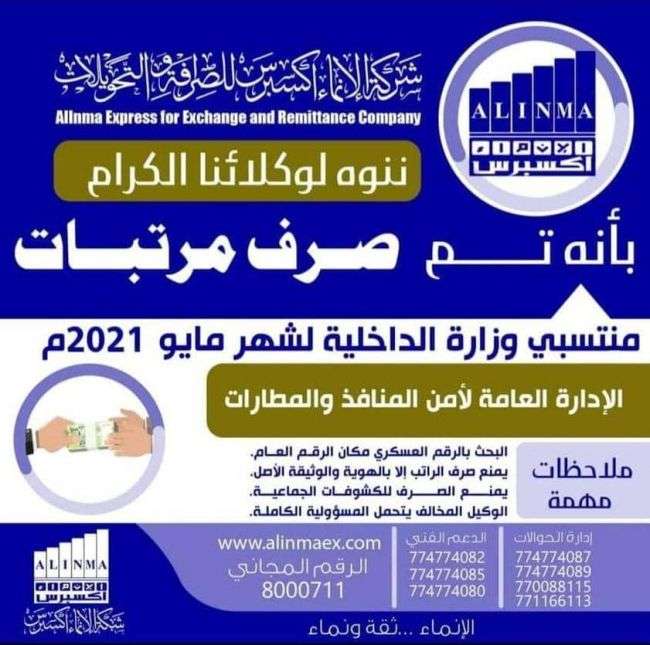 بدأت عصر اليوم عملية صرف مرتبات وزارة الداخلية لشهر مايو 2021م عبر شركة الانماء اكسبرس للصرافة