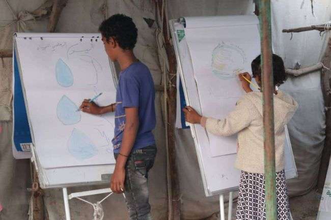 اقام مشروع الإمداد المائي والاصحاح البيئي التابع لمركز الملك سلمان للاغاثة والاعمال الانسانية والمنفذ في مخيمات مدينة الخوخة مسابقات رسم للاطفال النازحين في مخيمات الجشة وال جابر أحد أكبر مخيمات المدينة .