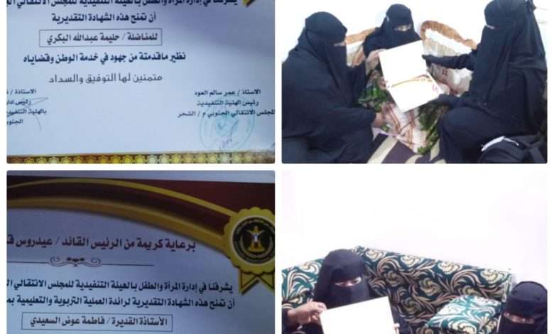في لفتة كريمة من إدارة المرأة والطفل بالهيئة التنفيذية للقيادة المحلية للمجلس الإنتقالي الجنوبي بمديرية الشحر، قامت رئاسة الإدارة بزيارتين منفصلتين لكل من الاستاذة (فاطمة عوض السعيدي) احدى رائدات العمل التربوي والتعليمي بمديرية الشحر، والناشطة (حليمة عبدالله البكري) من رائدات النشاط السياسي والمجتمعي بالمديرية. وذلك تقديرا وعرفانا بالجهود التي بذلت من قبل الرائدتين وماقدمتاه من خدمات جليلة لصالح وطنهم ومجتمعهم.