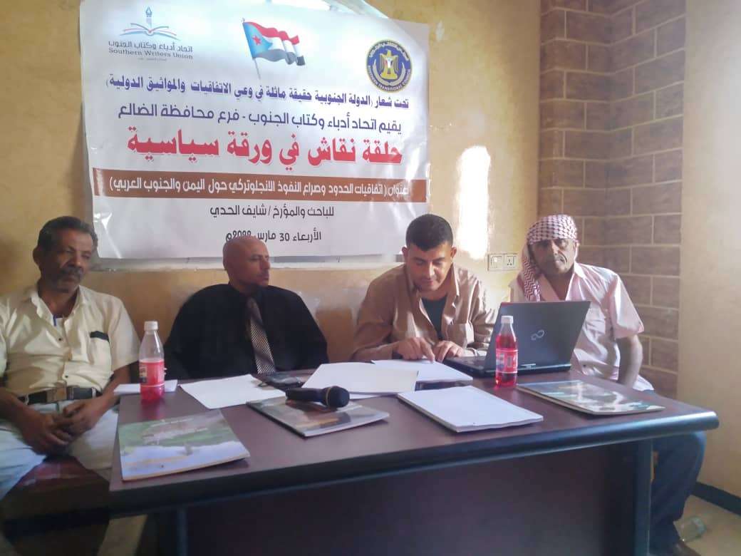 في طريق تأصيل مفهوم الهوية الجنوبية ثقافياً وتاريخيا  وتحت شعار (الدولة الجنوبية  حقيقة ماثلة في وعي الاتفاقيات والمواثيق الدولية ) أقام اتحاد أدباء وكتاب الجنوب فرع محافظة  الضالع اليوم الاربعاء  2022/3/30 م في مقر الفرع في الضالع حلقة نقاش  في ورقة سياسة  للباحث والمؤرخ / شايف محمد قاسم الحدي  تحت عنوان :اتفاقيات الحدود وصراع النفوذ الانجلوتركي حول اليمن والجنوب العربي ..