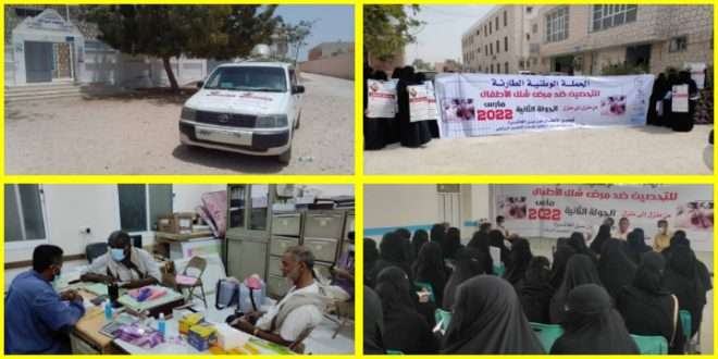 تراسها مدير مكتب الصحة والسكان الدكتور حسني بن فضل وشرفها بحضور التدشين الاستاذ سالم العطيشي مدير عام المديرية وكلل حضورها بالتوجيه والنصائح الصحية تخص التطعيم واعطاء فيتامين أ الاستاذ فؤ اد علي بامطرف مدير الرعاية الصحية الاولية بالمحافظة في الدورة التدريبية للعاملين الصحيين في الميدان والمواقع الثابتة في المراكز الصحية ومراكز الامومة والطفولة تخللها نزول المشرفين الخارجيين من المحافظة وعلي مستوي منظمة الصحة العالمية واليونسف الممولين للحملة