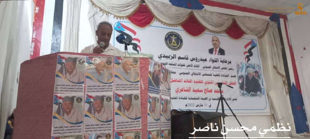 وفي كلمة اسرة الفقيد المناضل محمد صالح سعيد الشاعري التي القاها نجلة الاكبر المناضل/ عارف محمد صالح سعيد مدير الادارة التنظيمية بالمجلس الانتقالي الجنوبي محافظة الضالع والذي رحب في مستهلها بجميع الحاضرين شاكرا تفعالعهم بالحضور وفائا وعرفانا لرفيق دربهم واكدا نجل الفقيد في كلمتة على اعتزازة بالسجل النضالي الزاخر لوالدة معتبرا رحيلة خسارة فادحة ليس فقط على اسرتة وانما على الوطن قاطبة واعرب عن شكرة وتقديرة لرئيس القائد عيدروس الزبيدي على حفاوة الاهتمام والرعاية التي اولاها للاسرة ..
