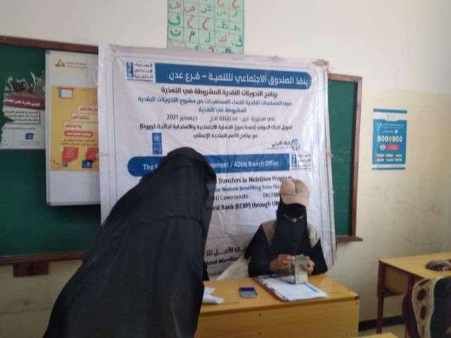 دشن الصندوق الاجتماعي للتنمية فرع عدن في محافظة لحج مديرية تبن صرف المساعدات النقدية للنساء المستفيدات من مشروع التحويلات النقدية المشروطة بالتغذية المرحلة الثانية وذلك بتمويل من البنك الدولي " منحة تعزيز الحماية الاجتماعية والاستجابة لجائحة كورونا عبر برنامج الأمم المتحدة الانمائي .