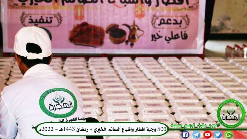 منذ أول أيام الشهر الكريم، وفي إطار حملتها الرمضانية الثامنة (رمضان عطاء وإحسان) ، من هذا العام 1443هـ - 2022م، تواصل مؤسسة الهجرة الخيرية للتنمية في العاصمة عدن، برنامجها الرمضاني المنسق بنجاح مشروع إفطار واشباع صائم الخيري لشهر رمضان الكريم، والذي يقدم يومياً اكثر من 500 وجبة إفطار محتوية على (التمر والماء والشربة والأرز والدجاج).
