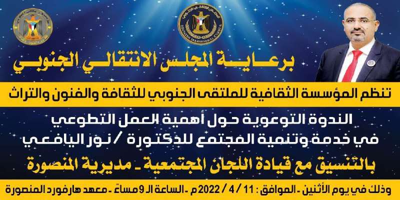 برعاية المجلس الانتقالي الجنوبي تنظم المؤسسة الثقافية للملتقى الجنوبي للثقافية والفنون والتراث ندوة توعوية بالعاصمة عدن .