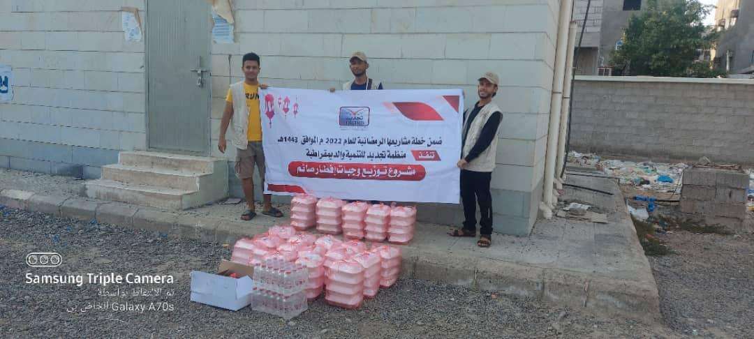 ضمن خطة مشاريعها الرمضانية للعام 2022م الموافق1443ه، منظمة تجديد للتنمية والديمقراطية تواصل تنفيذ مشروع توزيع وجبات إفطار صائم بالعاصمة المؤقتة عدن.