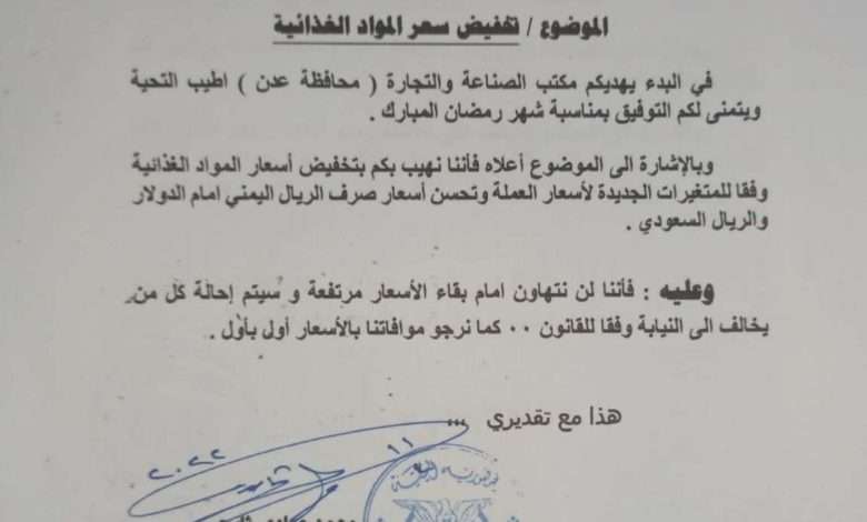 مدير عام الصناعة بعدن يوجه تعميما هاما إلى كبار التجار بتخفيض السلع الغذائية