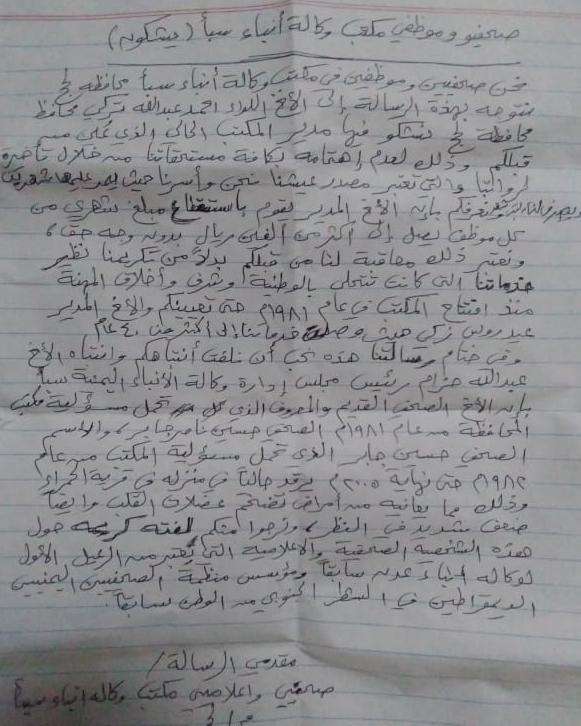 ناشد عدد من الصحفيين والموظفين في مكتب فرع وكالة سبأ للأنباء بلحج ، اللواء ركن احمد تركي محافظ محافظة لحج ، بسرعة علاج الصحفي حسين ناصر جابر ، من أبناء مديرية تبن قرية الحمراء ، والذي كان مدير لمكتب الوكالة من عام 1982 وحتى 2005م ، وجاء في المناشدة على أن الصحفي حسين ناصر ، يعاني حالياً من مرض تضخم عضلات القلب مع ضعف النظر ، مما يستحق من المحافظ احمد التركي والأخ عبدالله عزام رئيس مجلس إدارة وكالة سباء للأنباء التدخل في علاجه وقبل أن تتدهور حالته الصحية ، من جانب اخلاقي وانساني وتقدير لخدماته في العمل لأكثر من 40 عام .