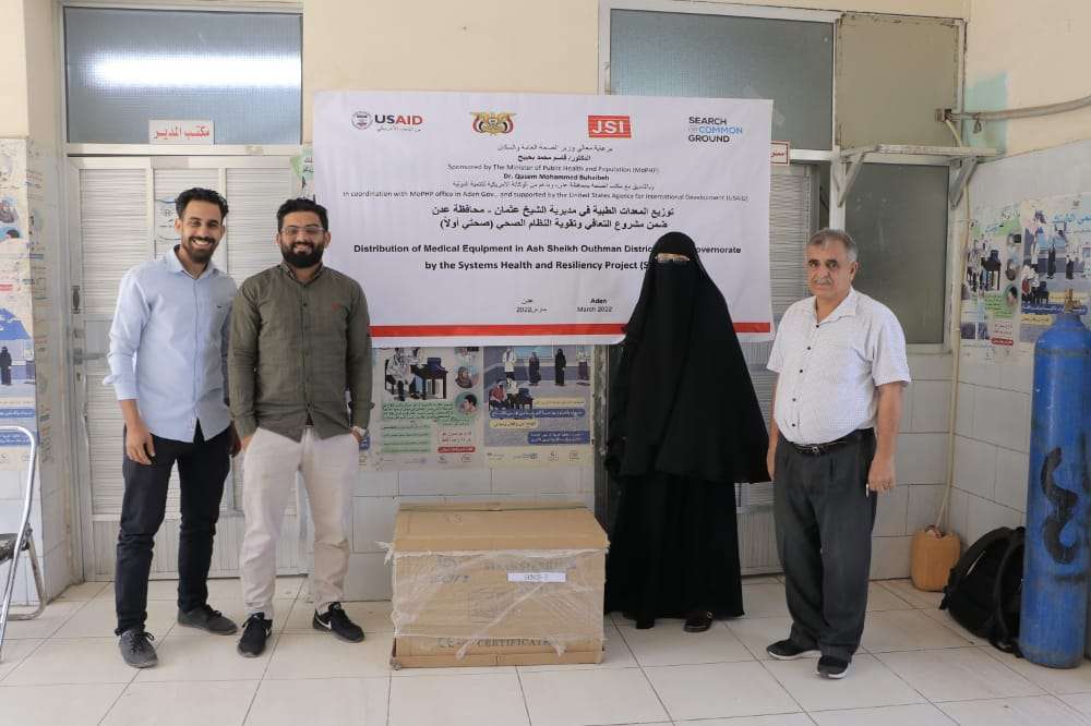 في إطار  جهود مكتب الصحة في المحافظة لدعم المرافق الصحية وبتمويل من الوكالة الأمريكية للتنمية الدولية وبقيادة منظمة جون سنو نفذت منظمة البحث عن أرضية مشتركة ووفق الجلسات الحوارية المجتمعية المنفذة مسبقاً لتحديد التدخلات في المرافق المرشحة ضمن مشروع التعافي وتقوية النظام الصحي "صحتي أولاً" الذي يسعى الي الاهتمام بالصحة الانجابية وصحة الامهات وحديثي الولادة والاطفال والتغذية، سلمت (7) اجهزة طبية للمراكز الصحية المستهدفة بحضور مدراء مكاتب الصحة وهم: "الدكتورة هدى باذيب مديرة مكتب الصحة لمديرة الشيخ عثمان والدكتورة آمل راشد مديرة مكتب الصحة لمديرة دار سعد والدكتور فهد عبدالقوي ,مدير مكتب الصحة لمديرة البريقة) للمراكز الصحية", التالية: