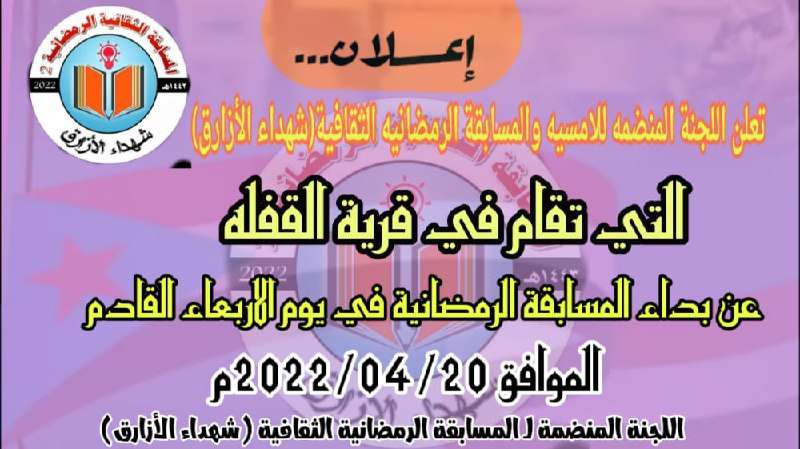 تعزيزاً لدور المحبة وتجسيدا لروح الاخوة بين أبناء المديرية، ومن أجل خلق جو تنافسي راقي وثقافي بين شباب المديرية،ومن أجل أولئك الشهداء رحمة ربي تغشاهم الذين رووا الأرض بدمائهم الزكية تقرر اللجنة المنظمة للمسابقة الثقافية الرمضانية لشهداء الأزارق اقامة الامسية الرمضانية والمسابقة الثقافية في يوم الأربعاء الموافق 20 ابريل 2022 في العاصمة الثقافية لمديرية الأزارق(القفلة).