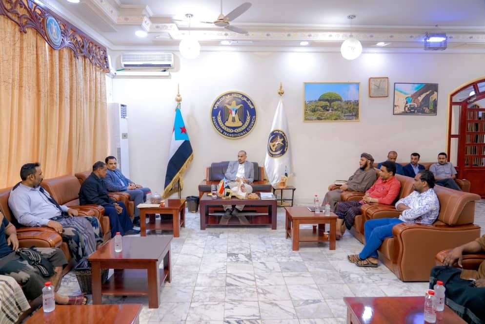 التقى الرئيس القائد عيدروس الزُبيدي رئيس المجلس الانتقالي الجنوبي، اليوم السبت، عددا من أبناء محافظة أرخبيل سقطرى يتقدمهم المهندس رأفت الثقلي رئيس الهيئة التنفيذية للقيادة المحلية للمجلس بالمحافظة.