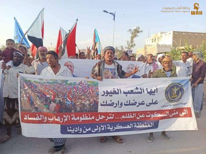 شهدت مديريات وادي وصحراء حضرموت مسيرات جماهيرية غاضبة سلمية تطالب المجلس الرئاسي بسرعة تنفيذ الشق العسكري من إتفاقية ومشاورات الرياض بنقل قوات المنطقة العسكرية الاولى وإحلال قوات النخبة الحضرمية بدلاً عنها لتثبيت الأمن والاستقرار والسكينة العامة للمواطنين في المديريات ، وهنا نسرد إليكم تصاريح لعدد من المواطنين.
