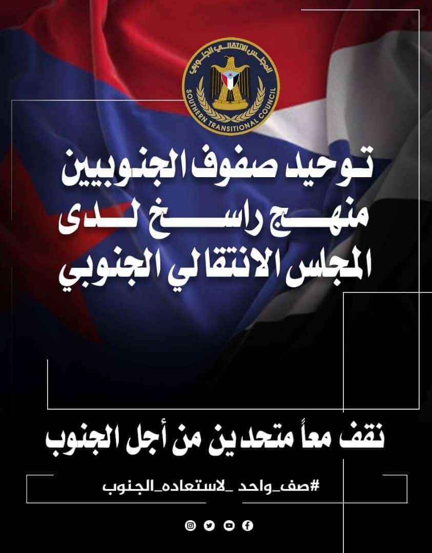 وأشاروا الى ان: "توحيد صف أبناء الجنوب يُعد منهجًا راسخًا لدى المجلس الانتقالي الجنوبي، ومهمة وطنية لن يتخلى عنها"، مؤكدين ان: "ما يجمع الجنوبيين، ويوحدهم هو استعادة الحق الجنوبي، ومواجهة الاحتلال والإرهاب بكافة أشكاله".