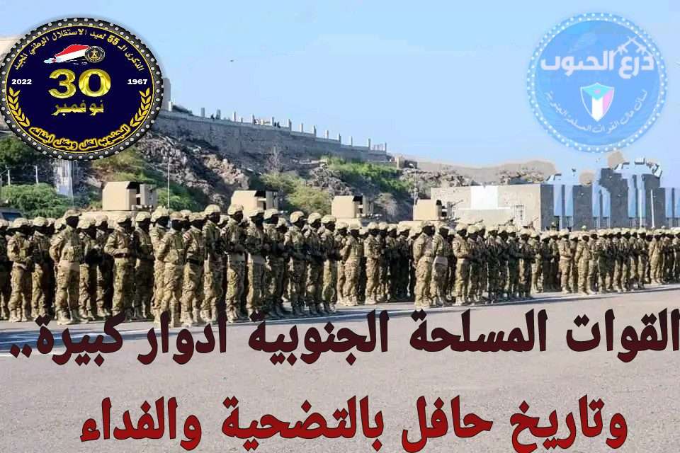 المجد سالف عصره والتاريخ يشهد زحفه في كل معركة .. بواسله أيقظوا سالف الأزمان في 14 أكتوبر و30 من نوفمبر .. إنه الجيش الجنوبي حامي الحمى والدار وقاهر المليشيات الحوثية ومحطم عروش العناصر الإرهابية.. هزم أكبر إمبراطورية استعمارية “إنجلترا” والاحتلال اليمني واذناب إيران وما زال يقدم التضحيات حتى هذه اللحظة.