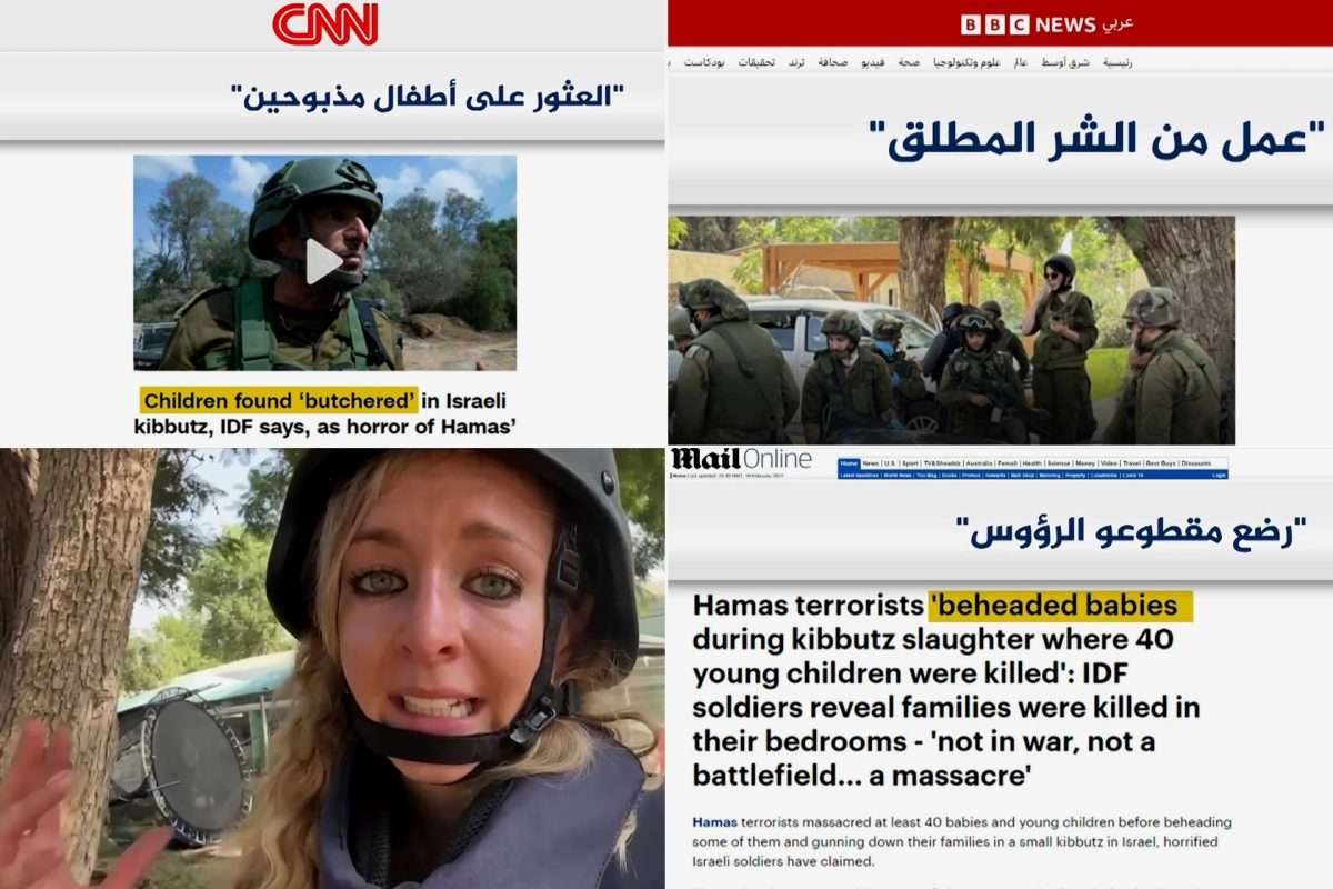 الأنباء التي اعتُمدت في الغرب على أنها حقائق -دون تحقق- أُفردت لها تغطيات بالساعات قبل أن يظهر سريعا أنها مُؤسّسة على قيل وقال مصدره جندي اسمه ديفيد بن زيون، وهو من عتاة المستوطنين، ولطالما دعا إلى قتل الفلسطينيين، وقد حدّث قناة إسرائيلية وطارت بها الأنباء كحقيقة في كبرى قنوات التلفزة الغربية وتصدّرت صحفهم.