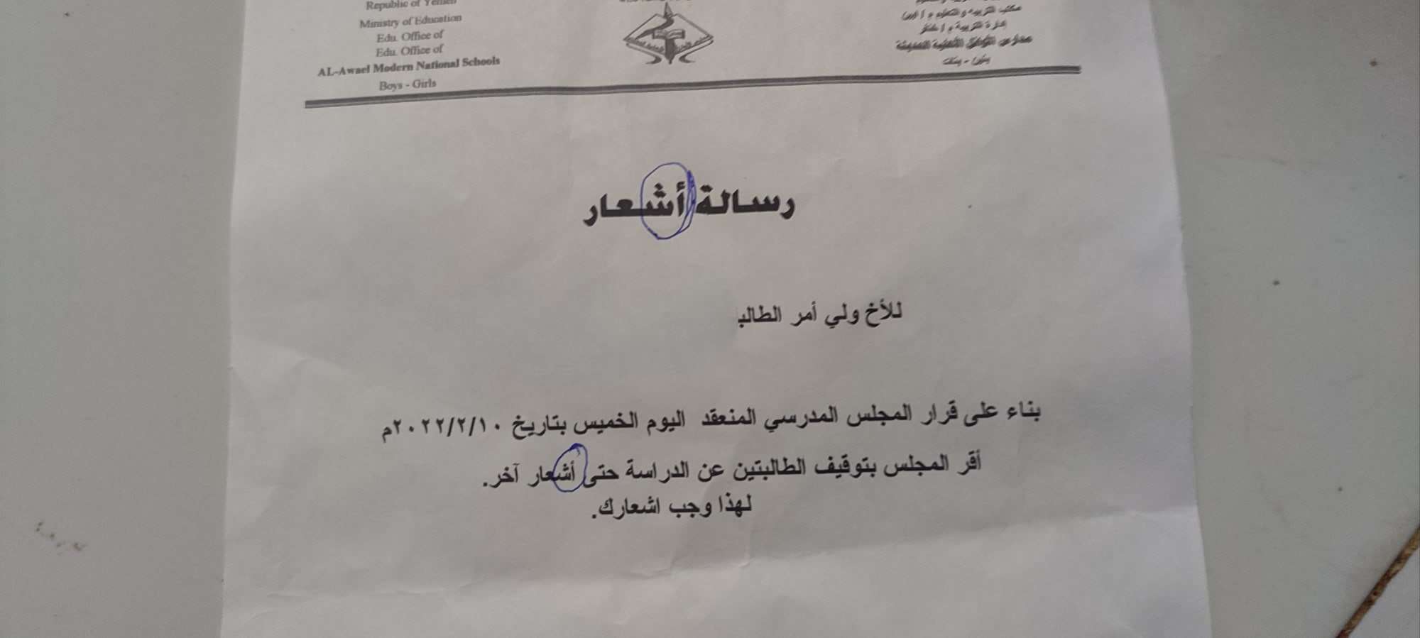 الجدير ذكره أن مدارس الأوائل بجعار عندما أتخذت قرار إيقاف الطالبات من الدراسة بدون ذنب ارتكبته الطالبتين عجزت المدرسة في أن تكتب إشعارا صحيحا يخلو من أبسط الأخطاء ، والدليل أن الخطأ تكرر مرتين وفي الثالثة تركوا الكلمة بدون همزة لأنهم لايعلمون أين موقع الهمزة .