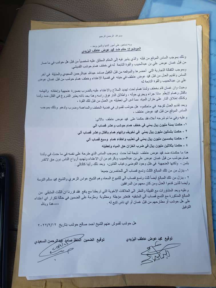 وذلك بموجب الساس الموقع من قبله والذي يشير فيه الى الحكم المطلق عليه شخصياً من قبل أهل حوشب فيما صار من قبل غسان عوض علي بن عبدالحبيب والقوة التابعة له في خطف همام حوشب القميشي ..