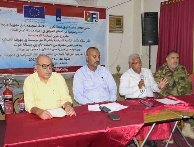تم صباح اليوم الأثنين بمديرية صيرة بالعاصمة عدن إطلاق مبادرة فريق لجنة تعزيز السلامة في المديرية للحد والتوعية من أخطار الحرائق في أحياء مديرية كريتر ضمن مشروع تعزيز السلامة المحتمعية الذي ينفذه منتدى التنمية السياسية بالشراكة مع مؤسسة بيرجهوف الألمانية وبدعم وتمويل مشترك من الإتحاد الأوروبي ومملكة هولندا برعاية مأمور مديرية صيرة لتنفيذ مبادرة تدريب التوعية للحد من أخطار الحياة الحرائق للشباب في مديرية صيرة. وأستهل الحفل بآي من الذكر الحكيم تم القيت كلمة من قبل الأخ/سليم شوعان رئيس لجنة سلامة المجتمعية رحب فيها بالمشاركين .