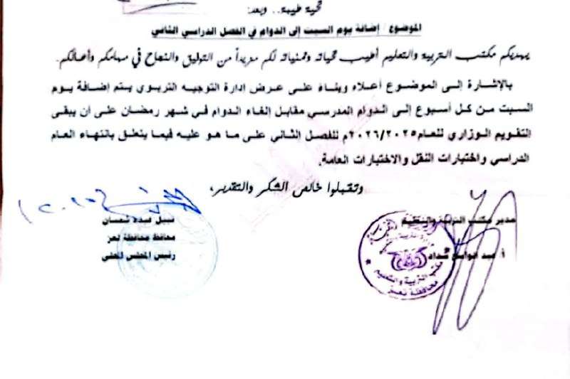 أعلنت إدارة مكتب التربية والتعليم بمحافظة تعز، اليوم، عن قرار جديد يقضي بإضافة يوم السبت من كل أسبوع ضمن أيام الدوام المدرسي للفصل الدراسي الثاني من العام الدراسي 2025/2026م.