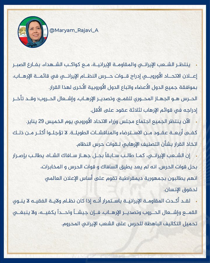وفي هذا السياق، نشرت السيدة مريم رجوي، الرئيسة المنتخبة للمقاومة الإيرانية، رسالة على حسابها في منصة «إكس»، أكدت فيها أن الشعب الإيراني والمقاومة الإيرانية، ومعهم أرواح الشهداء، ينتظرون بفارغ الصبر إعلان الاتحاد الأوروبي إدراج قوات الحرس في قائمة الإرهاب، بموافقة جميع الدول الأعضاء، ودعت إلى أن تحذو الدول الأوروبية الأخرى حذو هذا القرار.
