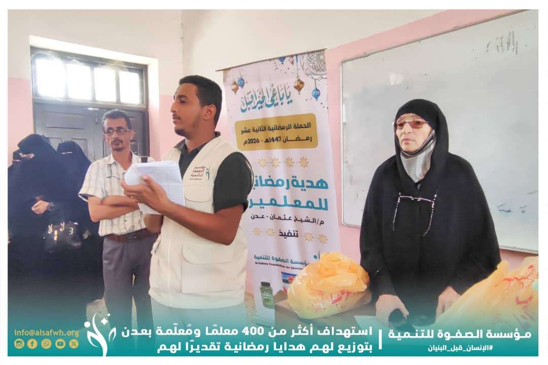 قدّمت مؤسسة الصفوة للتنمية بالعاصمة عدن، هدايا رمضانية لأكثر من 400 معلّم ومعلّمة في مدارس وثانويات مديرية الشيخ عثمان بالعاصمة عدن، وذلك في إطار الحملة الرمضانية الثانية عشرة "يا باغي الخير أقبل"، للعام 1447هـ – 2026م.