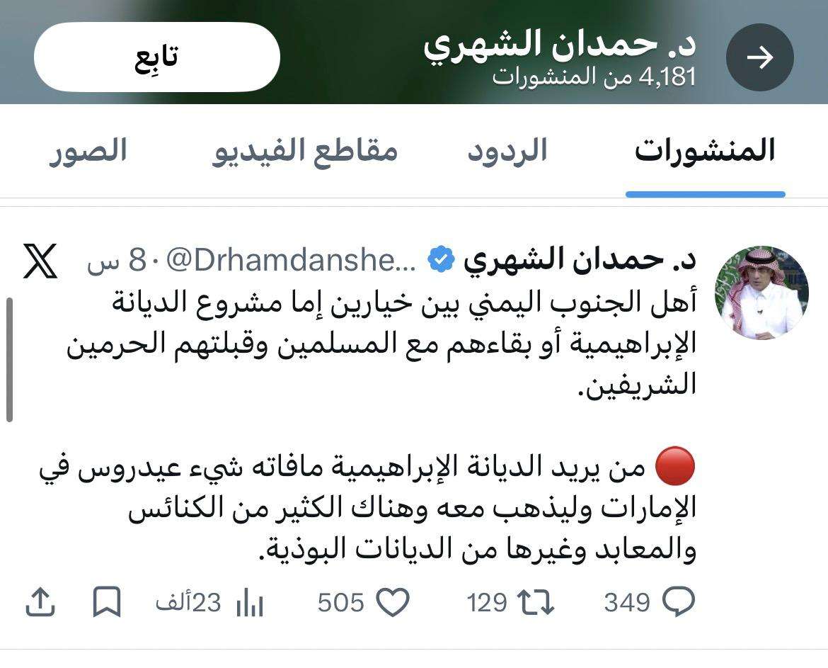 الكاتب، الذي يُنظر إليه بوصفه قريبًا من دوائر صنع القرار في الرياض، أشار في تدوينته إلى أن من “يريد الديانة الإبراهيمية فليذهب مع عيدروس في الإمارات”، في إشارة إلى رئيس المجلس الانتقالي الجنوبي عيدروس الزبيدي، ما فُسّر على أنه ربط بين مشروع استقلال الجنوب وبعض التحولات الإقليمية المرتبطة باتفاقيات التطبيع والحوار الديني.