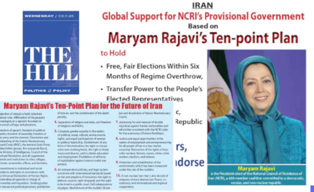 تناولت صحيفة "ذا هيل" (The Hill) المرموقة، في عددها الصادر يوم الأربعاء، 12 مارس 2026، تقريراً خاصاً حول الدعم العالمي المتزايد للحكومة المؤقتة التابعة للمجلس الوطني للمقاومة الإيرانية. يأتي هذا التأييد الدولي الواسع، والمبني على المبادرة الاستراتيجية المتمثلة في مشروع النقاط العشر الذي طرحته السيدة مريم رجوي، الرئيسة المنتخبة للمقاومة الإيرانية، في وقت وصل فيه نظام "ولاية الفقيه" إلى نهاية طريقه. ففي خضم الحرب الخارجية المدمرة التي أدت إلى تحطيم الآلة الحربية والأجهزة الأمنية للنظام وأسفرت عن مصلع علي خامنئي، باتت آفاق قيام إيران حرة ومستقرة عبر بديل منظم أقرب من أي وقت مضى.