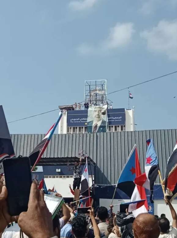 أعاد مواطنون، صباح اليوم الأربعاء، رفع صورة رئيس المجلس الانتقالي الجنوبي، ، فوق مبنى مقر الجمعية العمومية في مديرية التواهي بالعاصمة عدن.