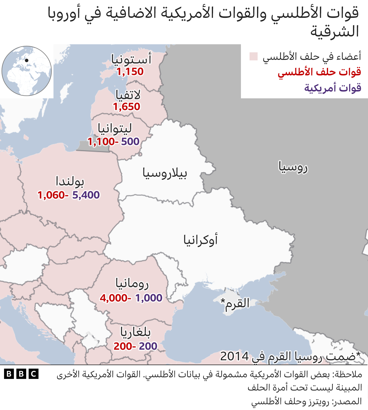 وألقى الرئيس بوتين باللوم جزئيا على قراره بالهجوم على توسع الناتو شرقا. وكان قد اشتكى في وقت سابق من أن روسيا "ليس لديها مكان آخر تتراجع إليه - هل يعتقدون أننا سنبقى مكتوفي الأيدي؟"وقال نائب وزير الخارجية سيرجي ريابكوف: "بالنسبة إلينا، من الإلزامي تماما التأكد من أن أوكرانيا لن تصبح أبدا عضوا في الناتو".مطالب بوتين الأساسية الأخرى هي أن لا ينشر الناتو "أسلحة هجومية بالقرب من حدود روسيا"، وأن يزيل القوات والبنية التحتية العسكرية من الدول الأعضاء التي انضمت إلى الحلف منذ عام 1997.وهذا يعني أوروبا الوسطى وأوروبا الشرقية ودول البلطيق. في الواقع، تريد روسيا أن يعود الناتو إلى حدود ما قبل عام 1997.