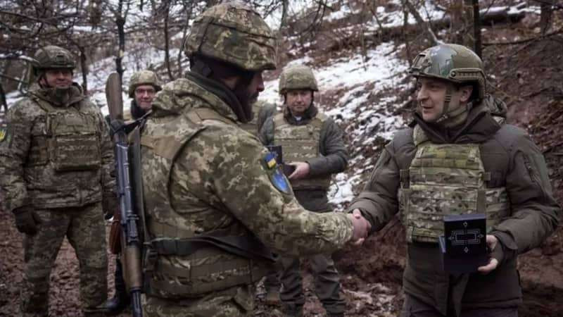 صور وزعتها السلطات الأوكرانية تظهر الرئيس الأوكراني في زيارة للجنود على الجبهة في ديسمبر/كانون الأول الماضي