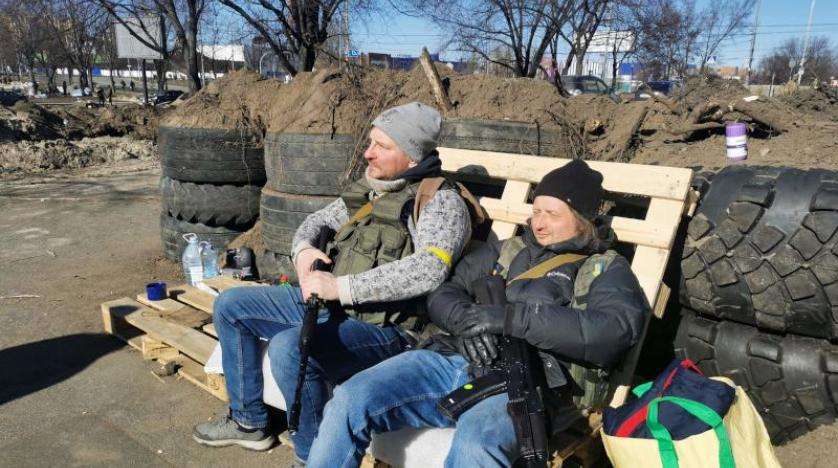 متطوعان أوكرانيان يحملان السلاح في كييف
