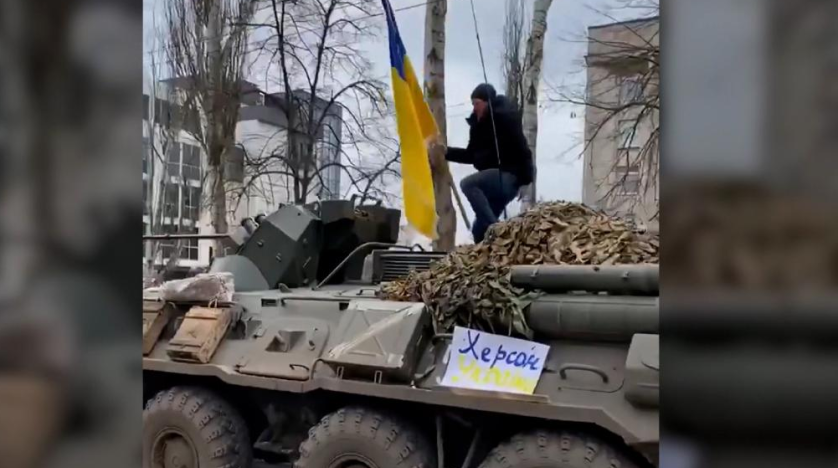 وسط تظاهر آلاف الأوكرانيين في وسط مدينة خيرسون (جنوب أوكرانيا)، بعد أيام من استيلاء القوات الروسية عليها، صعد رجل على متن مدرعة روسية أثناء تحركها ولوح بالعلم الأوكراني، وهي اللقطة التي تم تداولها على نطاق واسع على مواقع التواصل الاجتماعي.