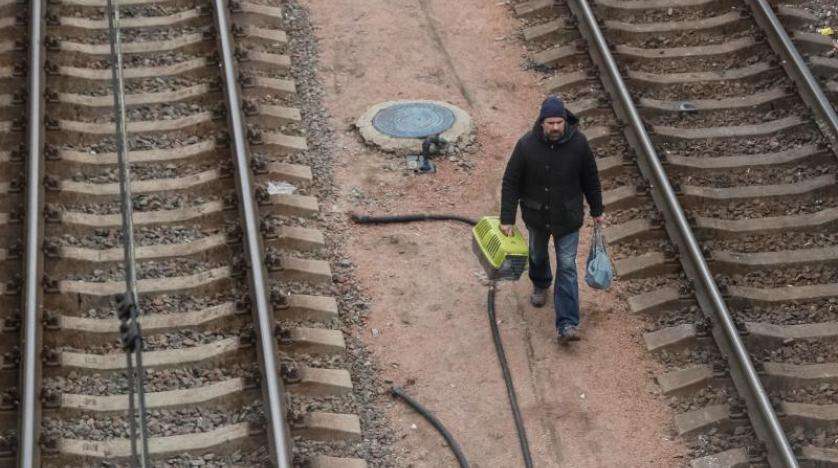 لاجئ أوكراني يمشي بين سكتي قطار في كييف الأوكرانية