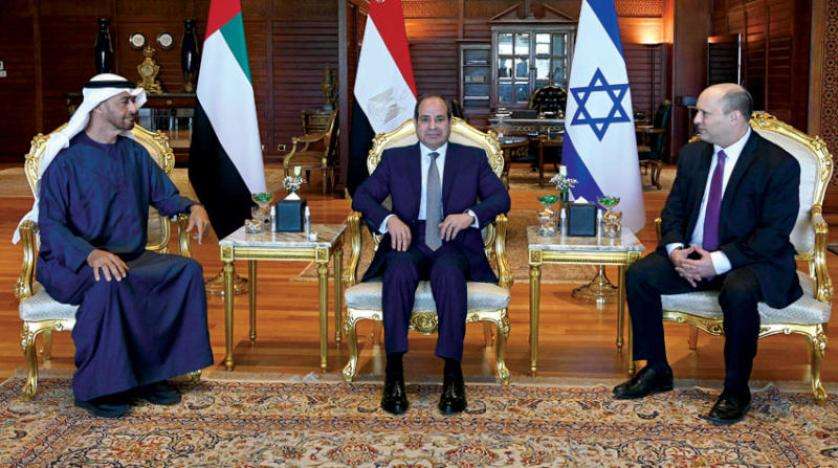 في أول لقاء ثلاثي من نوعه، استقبل الرئيس المصري عبد الفتاح السيسي، أمس، بمنتجع شرم الشيخ على البحر الأحمر، ولي عهد أبوظبي الشيخ محمد بن زايد آل نهيان، ورئيس الوزراء الإسرائيلي نفتالي بنيت، لإجراء محادثات قالت مصر إنها تناولت «تداعيات التطورات العالمية، خاصة ما يتعلق بالطاقة، واستقرار الأسواق، والأمن الغذائي».
