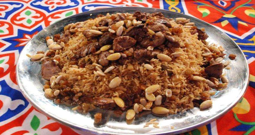 يُغرف الأرز في طبق التقديم وتوزع المكسرات المحمصة على الوجه، ويقدم على مائدة فطار أول يوم رمضان.